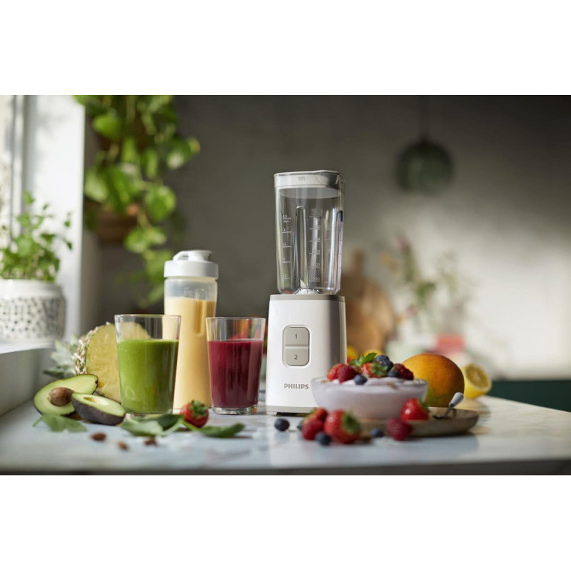 summary: Philips Daily Collection HR2602/00 Mini blender. Type: Tabletop blender, Product colour: Grey, White, Cord length: 0.85 m. Bowl capacity: 1 L, Rotational speed (min): 21080 RPM, Rotational speed (max): 28520 RPM. Blending bowl material: Styrene Acrylonitrile (SAN), Housing material: Plastic, Blade material: Stainless steel. Power: 350 W, Power source: AC, AC input voltage: 220 - 240 V. Width: 108 mm, Depth: 108 mm, Height: 334 mm