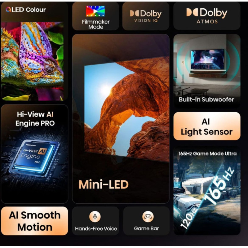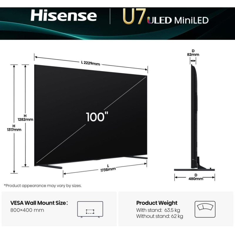 summary: Hisense 100U7Q. Display diagonal: 2.54 m (100"), Display resolution: 3840 x 2160 pixels, HD type: 4K Ultra HD, Display technology: ULED, Screen shape: Flat, LED backlighting type: Mini LED. Smart TV. Response time: 6.5 ms, Contrast ratio (typical): 5000:1, Native aspect ratio: 16:9. Digital signal format system: DVB-C, DVB-S, DVB-S2, DVB-T, DVB-T2. Wi-Fi, Ethernet LAN. Product colour: Black