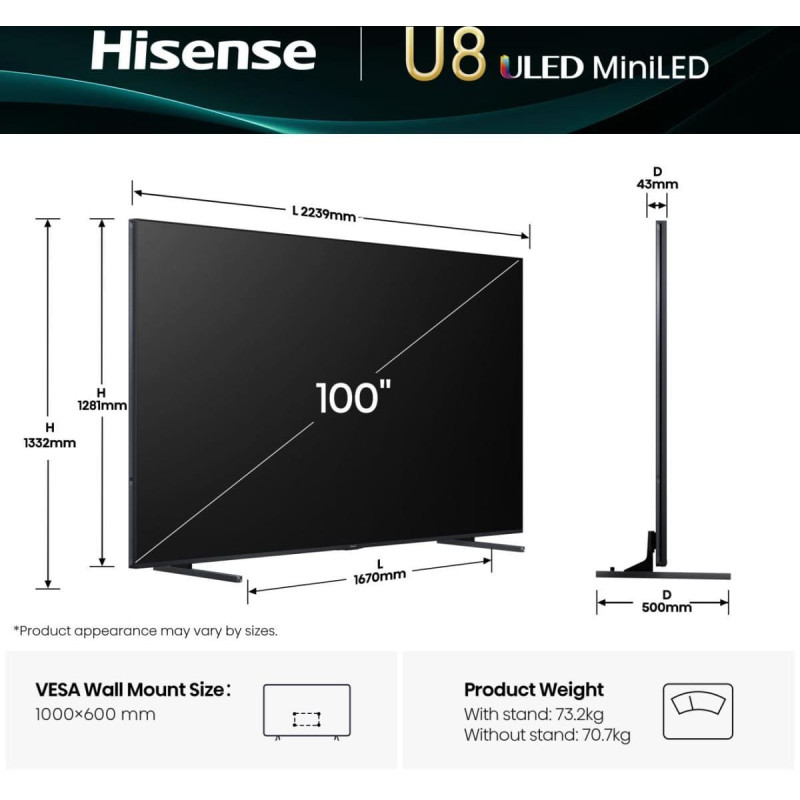 summary: Hisense 100U8Q. Display diagonal: 2.54 m (100"), Display resolution: 3840 x 2160 pixels, HD type: 4K Ultra HD, Display technology: ULED, Screen shape: Flat, LED backlighting type: Mini LED. Smart TV. Response time: 6 ms, Contrast ratio (typical): 5000:1, Native aspect ratio: 16:9. Digital signal format system: DVB-C, DVB-S, DVB-S2, DVB-T2. Wi-Fi, Ethernet LAN. Product colour: Black, Grey