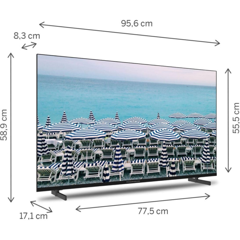 summary: Thomson G63 Series 43FD2S13. Display diagonal: 109.2 cm (43"), Display resolution: 1920 x 1080 pixels, HD type: 4K Ultra HD, Display technology: LED, Screen shape: Flat, LED backlighting type: Direct-LED. Smart TV. Native aspect ratio: 16:9. Digital signal format system: DVB-C, DVB-S, DVB-S2, DVB-T, DVB-T2. Product colour: Black