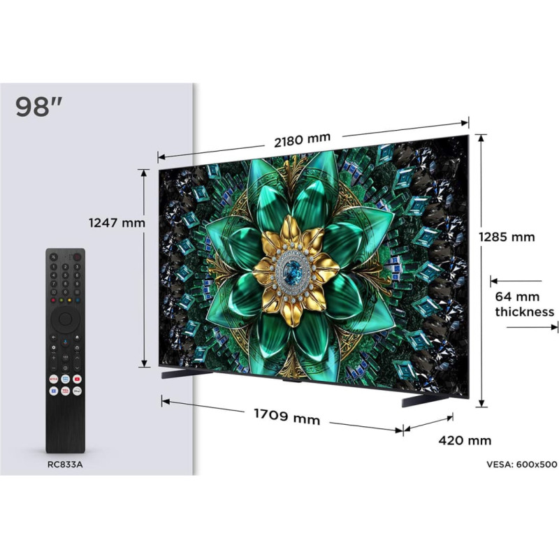 summary: TCL Q6C 98Q6C. Display diagonal: 2.49 m (98"), Display resolution: 3840 x 2160 pixels, HD type: 4K Ultra HD, Display technology: QD-Mini LED, Screen shape: Flat. Smart TV. Motion interpolation technology: PPI (Picture Performance Index) 4100, Native aspect ratio: 16:9. Digital signal format system: DVB-C, DVB-S2, DVB-T2. Wi-Fi, Ethernet LAN. Product colour: Metallic